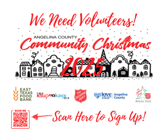 The combined efforts of the Salvation Army, Deep East Texas Community Resource Center, KSWP/KVAX, and Love INC will culminate in the Community Christmas on Thursday, December 18, 2025, from 9 AM – 4 PM. We are in need of volunteers to help organize and prepare for this exciting event, as well as serve on distribution day. Please review the available slots below and click on the button to sign up. Please feel free to sign up for more than one slot! Please have all minors volunteer with an adult partner. Thank you!